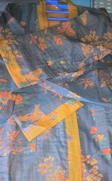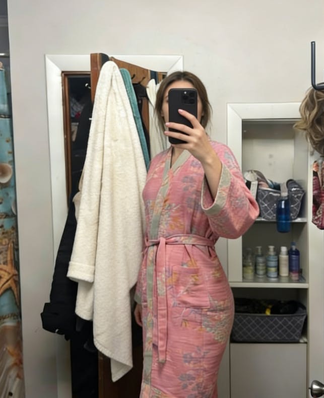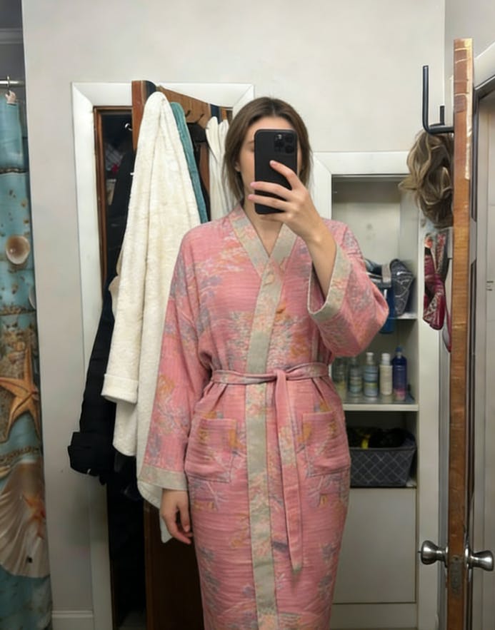 It features a timeless jacquard pattern with subtle retro detailing for classic charm. It works beautifully beyond home lounging as a beach cover-up or a casual layer for morning jogs. It keeps you looking stylish and elegant no matter where you wear it.